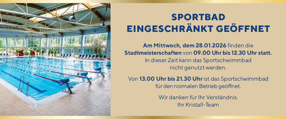 Die räumlich abgetrennte Sport-Schwimmhalle mit 25-Meter-Bahnen steht Ihnen zur Steigerung Ihrer körperlichen Fitness zur Verfügung. Jeden Dienstag und Freitag ist unser Sport-Schwimmbad bereits ab 07:00 Uhr geöffnet. Nutzung in Badekleidung und nur für Schwimmer. Die Temperatur des Sport-Schwimmbeckens liegt bei 26-27°C. Das Sportbecken mit Zuschauertribünen eignet sich auch hervorragend für besondere Schwimmsport-Veranstaltungen.